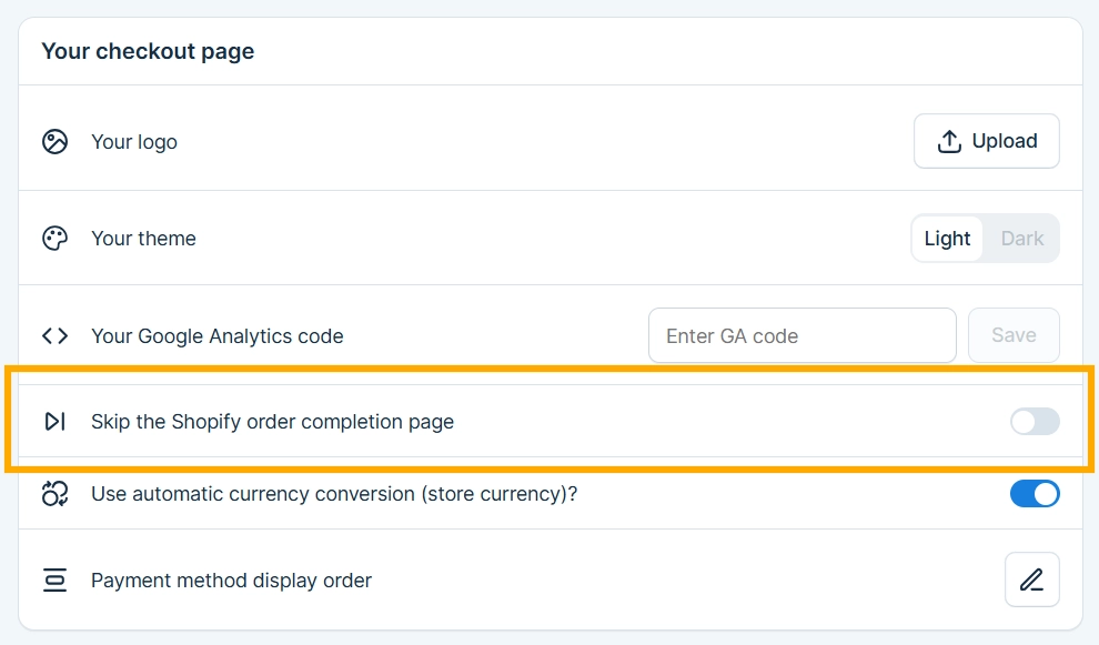 - Locate the toggle labeled “Skip the Shopify order completion page”.
