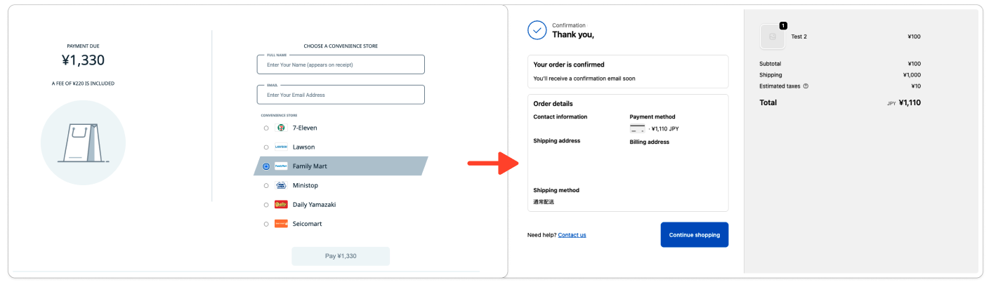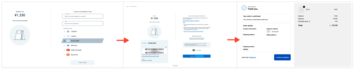 Convenience store, Pay-easy, and bank transfers normally display payment instructions on KOMOJU’s order completion page. When you skip this page, customers will only receive instructions via email. Ensure customers know to check email for payment details.
