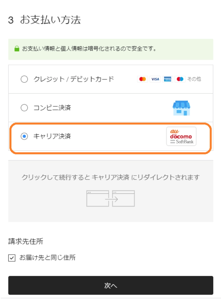Carrier payments are grouped as one selection on the initial checkout screen.