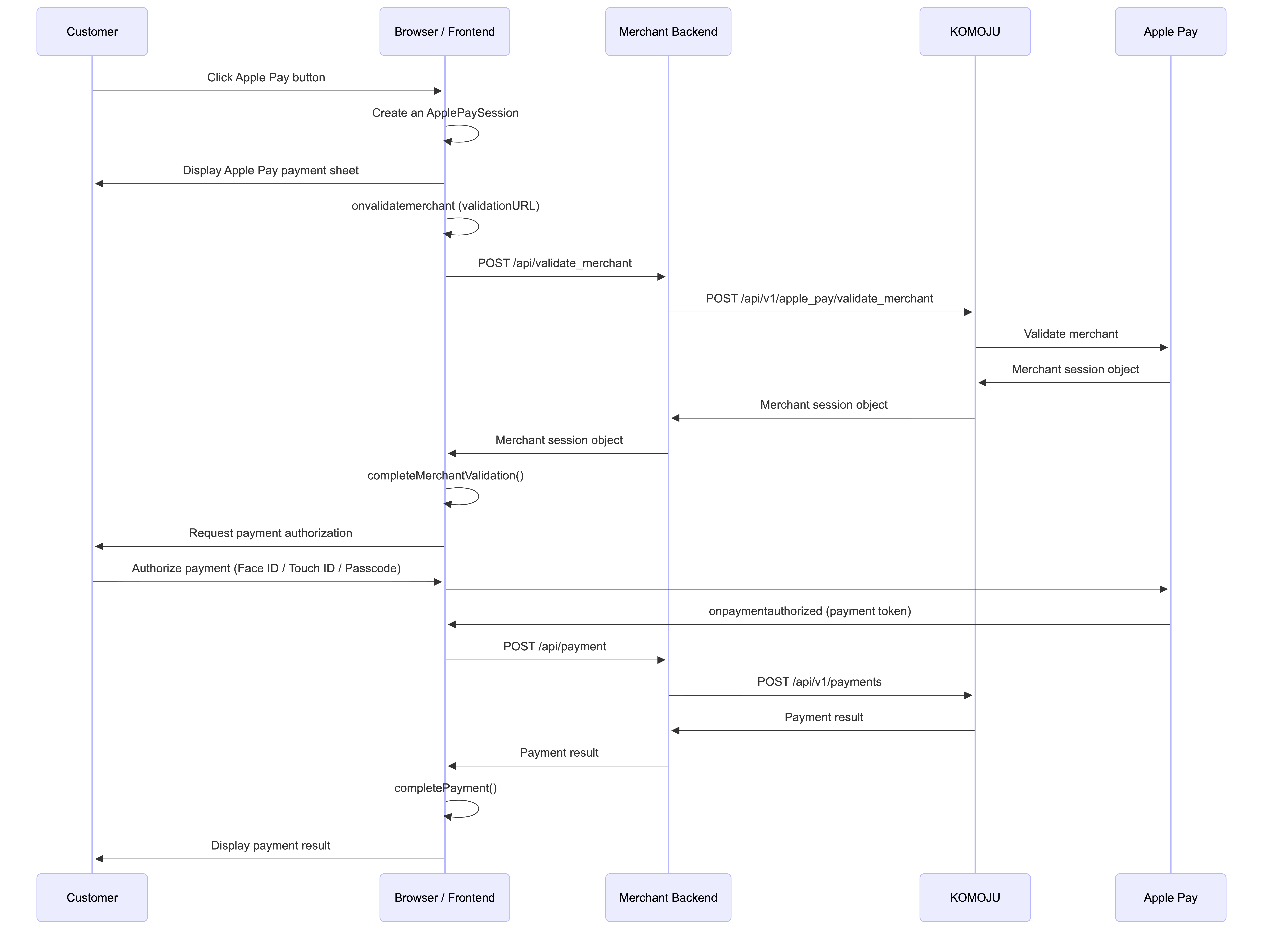 The following sequence diagram illustrates the Apple Pay integration flow using the KOMOJU API.